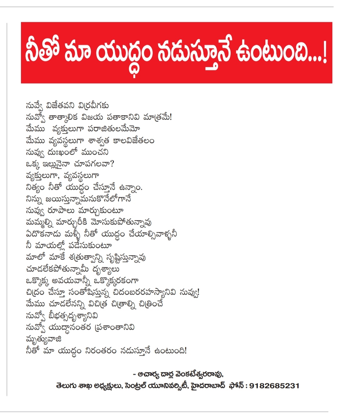 నీతో మా యుద్ధం నడుస్తూనే ఉంటుంది... ఆచార్య దార్ల కవిత
